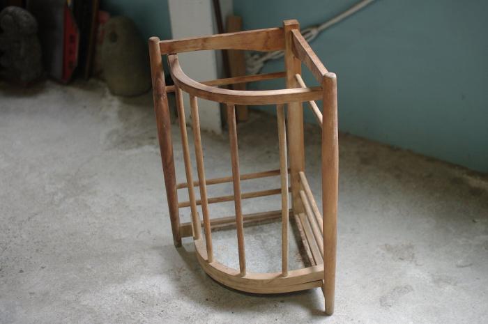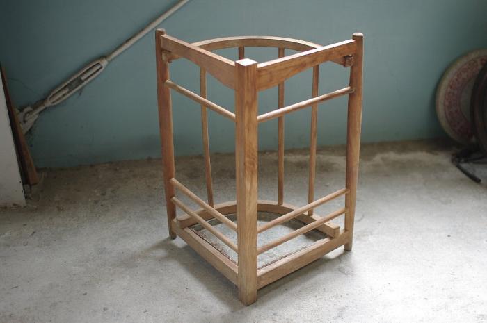 乾いた木味の古い傘立てです。両端の支柱に膨らみを持たせた洒脱なお品物です。