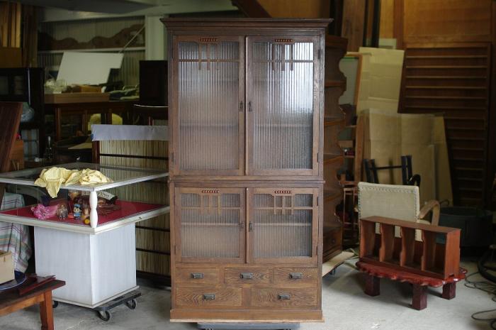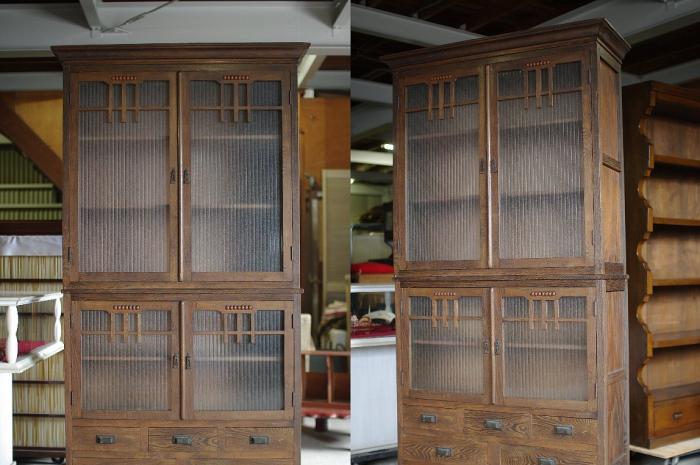 銀モールガラスが入った杢目が美しいモダンな上下二段組みの戸棚です。
