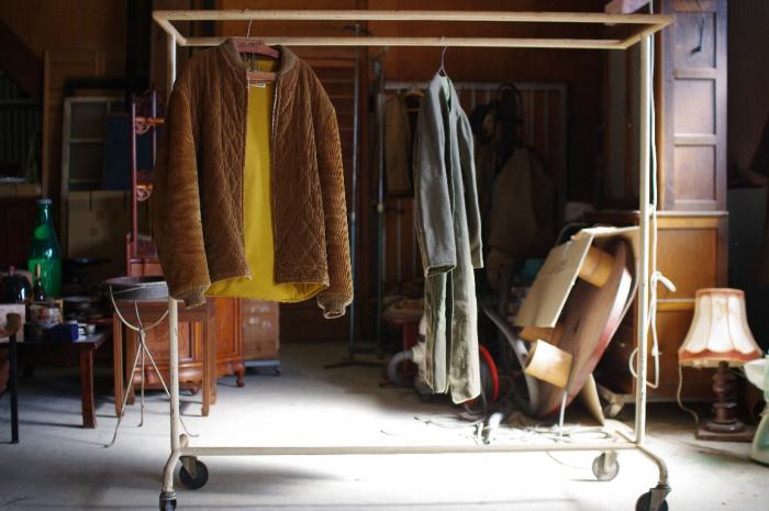 Top > Works > 古家具 古道具 > 縫製工場の鉄製ダブルハンガーラックキャスター付き▼レトロヴィンテージ陳列店舗什器古着屋2列ディスプレイラック